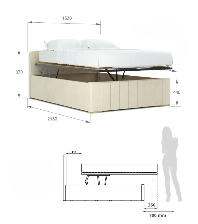 Inovatīvais divu funkciju mehānisms ļauj pacelt gultas rāmi paralēli zemei, kas atvieglo piekļuvi telpai zem gultas un gultas veļas maiņai.