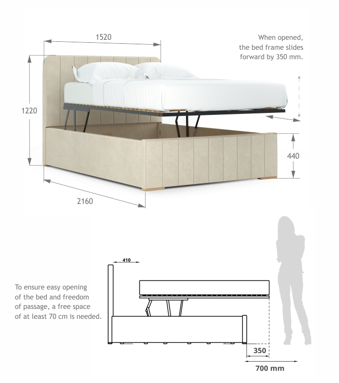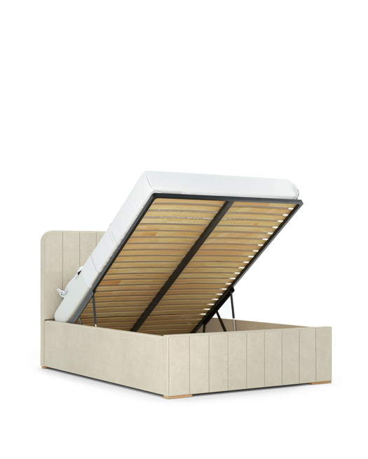 Inovatīvais divu funkciju mehānisms ļauj pacelt gultas rāmi paralēli zemei, kas atvieglo piekļuvi telpai zem gultas un gultas veļas maiņai.