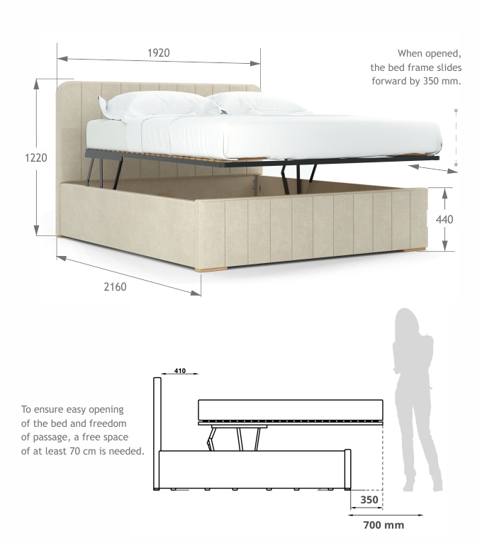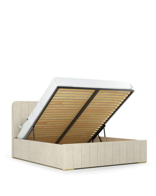 Inovatīvais divu funkciju mehānisms ļauj pacelt gultas rāmi paralēli zemei, kas atvieglo piekļuvi telpai zem gultas un gultas veļas maiņai.