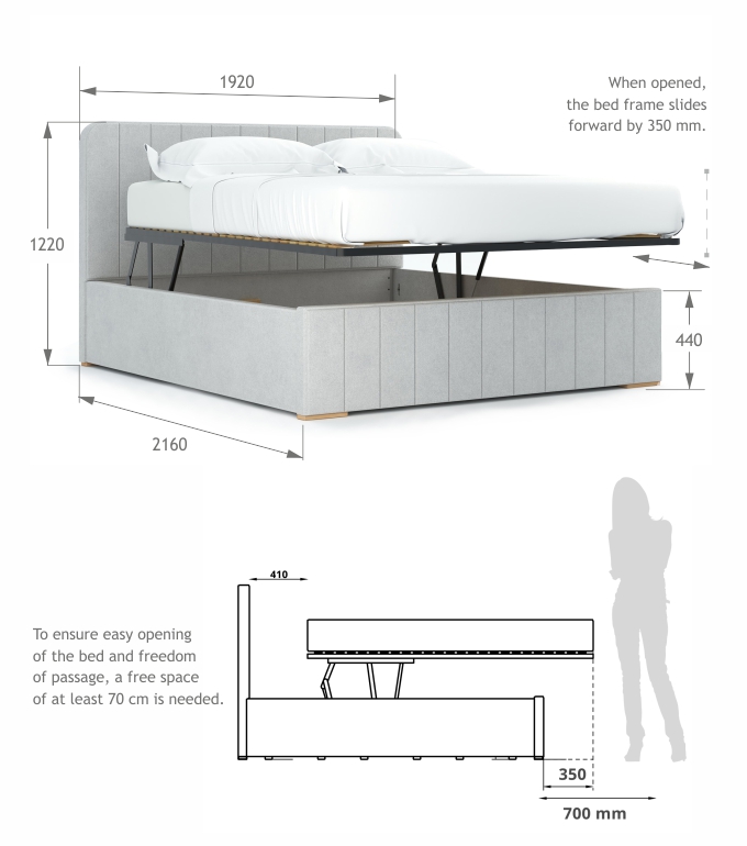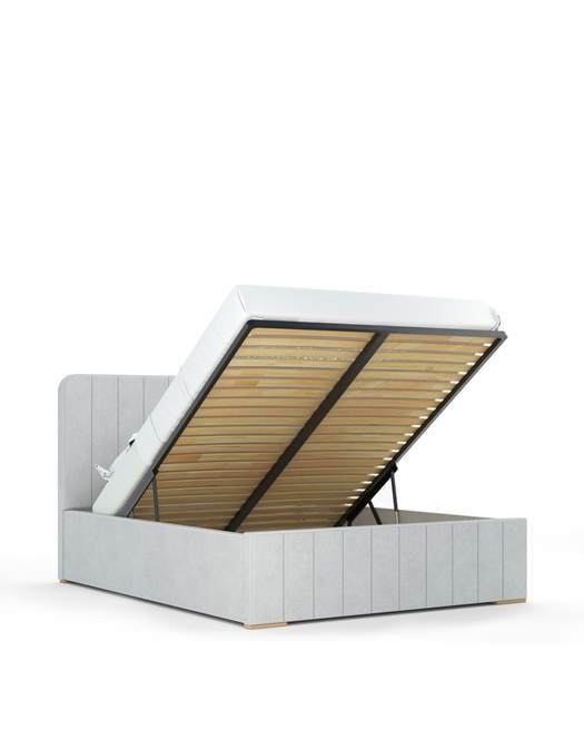 Inovatīvais divu funkciju mehānisms ļauj pacelt gultas rāmi paralēli zemei, kas atvieglo piekļuvi telpai zem gultas un gultas veļas maiņai.