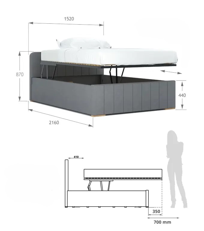 Inovatīvais divu funkciju mehānisms ļauj pacelt gultas rāmi paralēli zemei, kas atvieglo piekļuvi telpai zem gultas un gultas veļas maiņai.